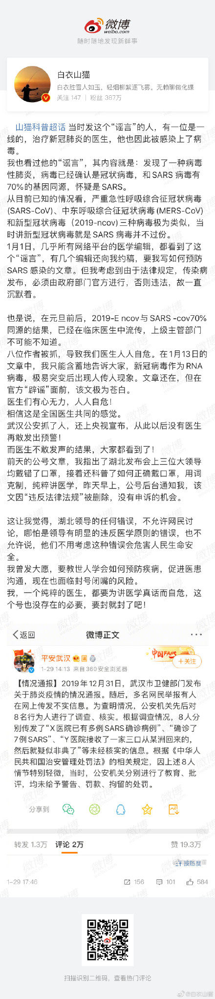 如今李医生人被感染躺在ICU,疫情扩散至全国。请还他一个公道和清誉吧,还有他热爱的事业。